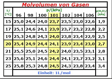 Gase sind kompromierbar! Wenn Sie vermeiden wollen, dass sich "22,4 L/mol" in den Schüler/innenköpfen wie eine Naturkonstante festsetzt, so kopieren Sie Ihrer Klasse einen Satz dieser Tabelle im A4 Format.